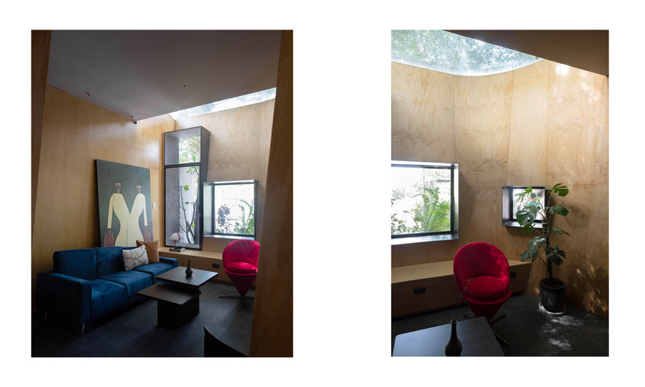 - The “Living Room”, a concealed area wrapped within one of the curves, clad in warm plywood, revealed only once guests fully enter the space — offering a sense of surprise and retreat. A skylight above filters natural light and the dynamic shadows of nearby trees, drawing a fragment of the outdoors inside.